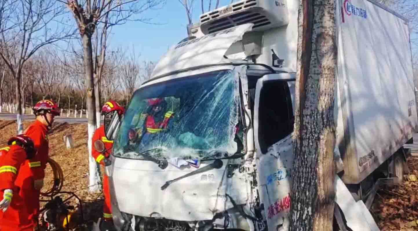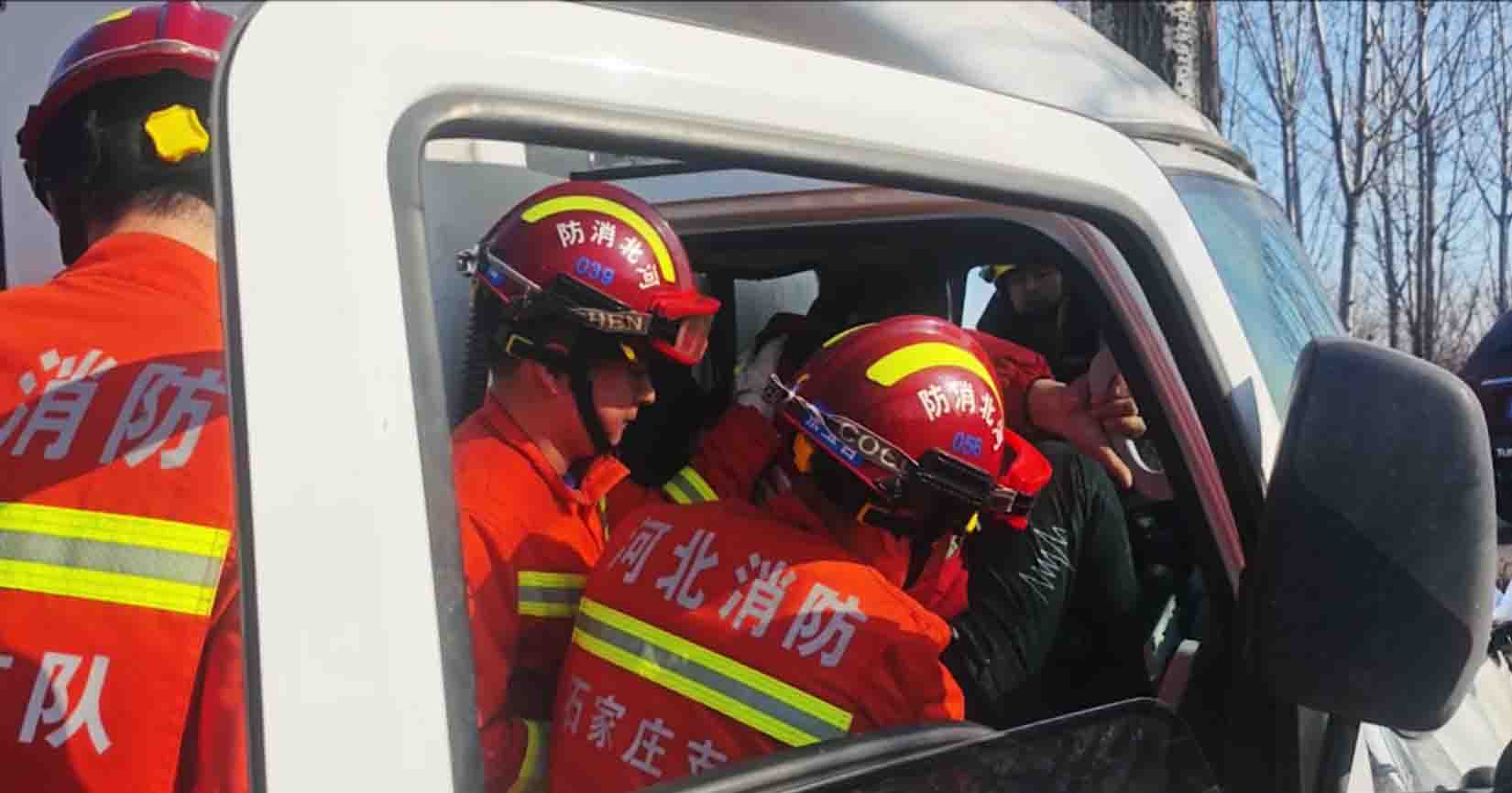 中经联播讯(通讯员/郭星怡)1月2日12时左右,石家庄市藁城区南董镇金五线北高庄村口一辆货车与一辆SUV汽车发生碰撞,随后货车撞树,货车司机被困驾驶室,石家庄市消防救援支队藁城世纪大道消防救援站接到报警迅速赶赴现场救援。