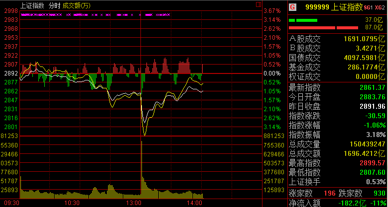 中国A股市场也难以摆脱外围市场牵引,上证指数午后急转直下,一度跌2.9%,至2807.6,创5月30日以来最大下跌。沪深300指数下跌2.5%;创业板指数下跌3.4%。