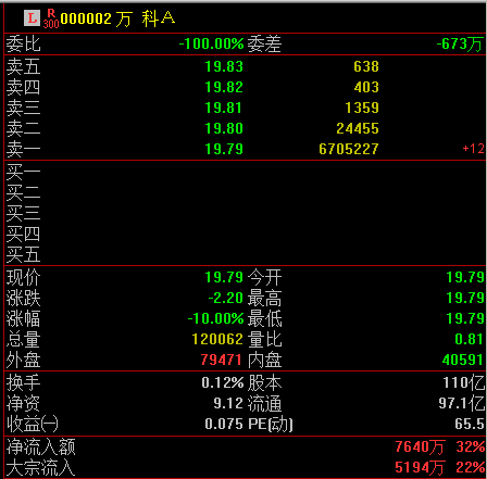 截至目前为止,万科A每股报19.79元;跌停板上现有逾622万手封单。此外,万科H股现跌0.1%,报每股16.20港元;上日大涨6.7%。