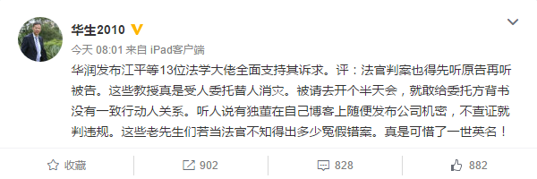 华生称:“华润发布江平等13位法学大佬全面支持其诉求。评:法官判案也得先听原告再听被告。这些教授真是受人委托替人消灾。被请去开个半天会,就敢给委托方背书没 有一致行动人关系。听人说有独董在自己博客上随便发布公司机密,不查证就判违规。这些老先生们若当法官不知得出多少冤假错案。真是可惜了一世英名!”
