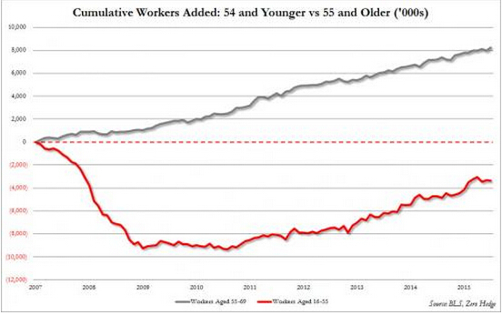 美国金融博客Zerohedge的统计显示,2007年以来,美国55岁及以上人群的新增就业人数合计超过800万人,而25岁到54岁的就业者却减少了340万人。