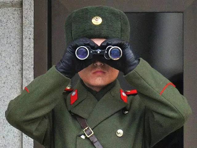 板门店,朝鲜人民军士兵查看着韩国方向的情况。