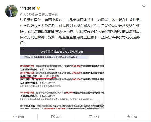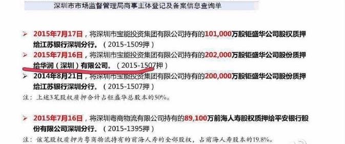 21世纪经济报道也提及了此次质押,称其所指为2015年7月16日,宝能投资集团曾将其持有的钜盛华公司20.2亿股质押给华润(深圳)有限公司,(2015-1507押):(下图来自认证为美林国际(香港)有限公司执行董事刘芮东的微博)