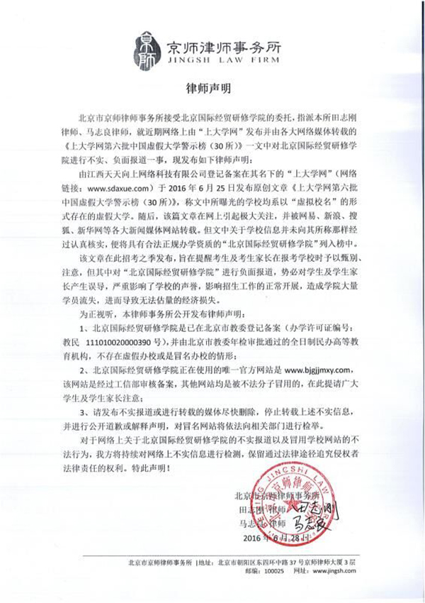 在披露第六批虚假大学名单的时候,因语言表述逻辑错误,致使身为正规大学的北京国际经贸研修学院“躺枪”。为此,北京国际经贸研修学院于6月28日下午发表《律师声明》,欲通过法律途径追究上大学网的侵权责任。