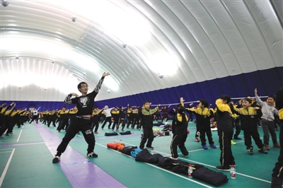 2015年12月8日,北京市空气重污染红色预警启动首日,在昌平区的北京私立汇佳学校具有新风系统的气膜馆内,部分寄宿学生在老师的带领下进行体育活动。新京报记者 李飞 摄