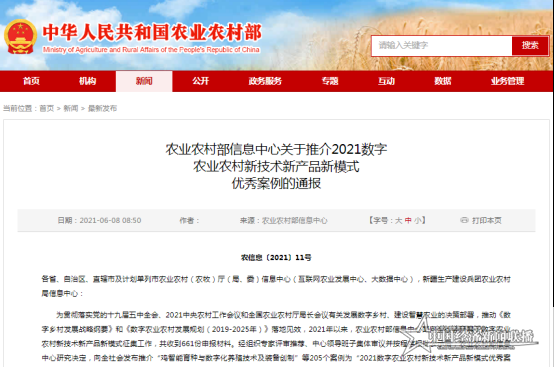 日前,国家农业农村部发布《关于推介2021数字农业农村新技术新产品新模式优秀案例的通报》,向全社会发布推介205个优秀案例,由司尔特公司完成的《“多库联动”大数据融合创新助力农业现代化》研究成果成功入选,为安徽省6个优秀案例之一。