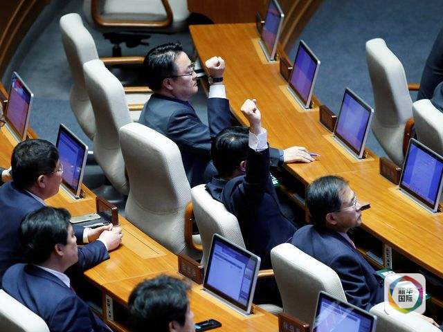 国会通过弹劾案后,议员举手庆祝。(新华/路透)