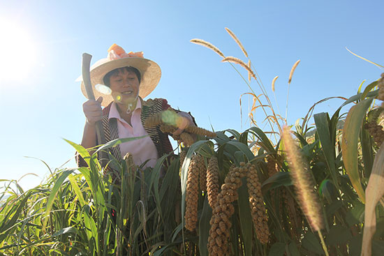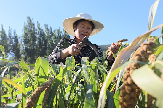 9月7日添加到日历,二十四节气中的白露时节,山东省临沂市平邑县万亩山地有机谷子喜获丰收,金色谷穗染黄大地,农民们忙着收获,山坡上、田野间、农院里一派忙碌的丰收景象。图为村民在收获成熟的山地谷子