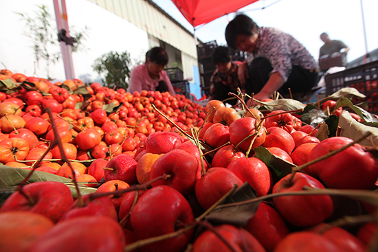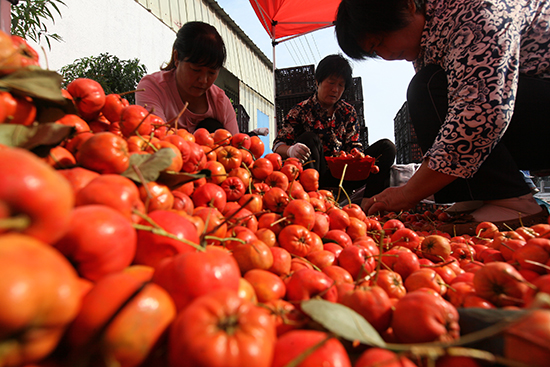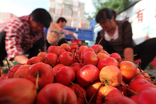 9月22日,山东省临沂市平邑县地方镇辛庄村村民在挑选销售收获的山楂。