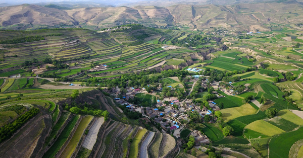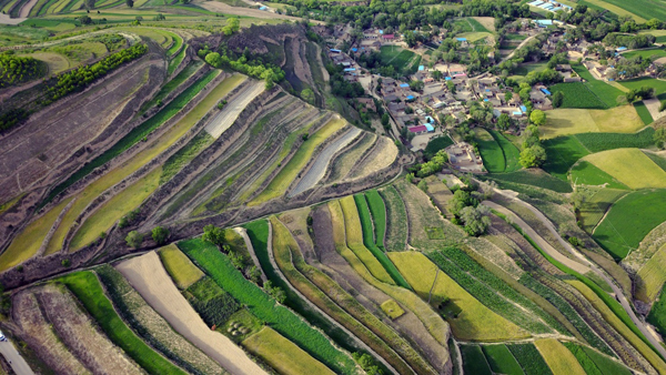 盛夏时节,甘肃省通渭县山间的梯田层层叠叠,色彩斑斓,在黄土高原上绘制出一幅幅美丽的画卷。