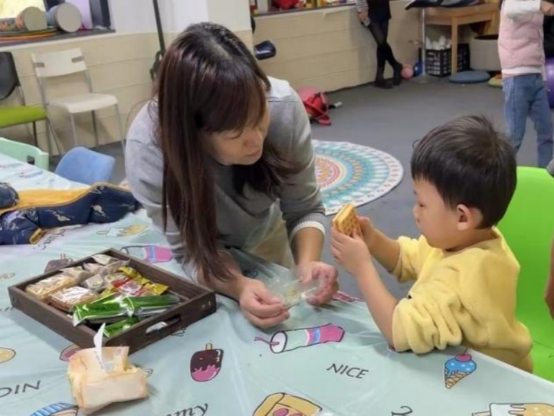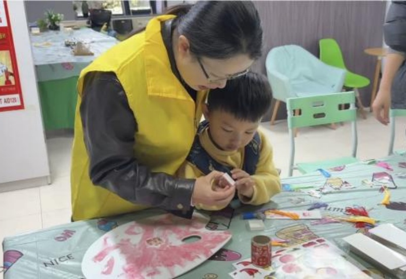在动手实践中,孩子们的手部精细动作能力也在悄然提升。从握笔涂色的力度控制,到剪裁贴纸的精准操作,再到粘贴装饰的层次搭配,每一个细微动作都锻炼着他们的手眼协调与专注力。孩子们认真地在书签上画出彩虹桥,又小心翼翼地贴上蝴蝶贴纸,志愿者老师与孩子互动,尽可能地激发孩子们的表达欲——“小宝贝你好厉害喔”