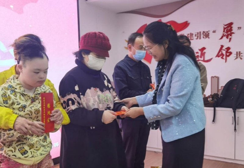 在物资捐赠环节,主办方代表们手捧着精心筹备的米、面、油、保暖衣物等生活物资,逐一送到在场的残疾人群体手中。鼓楼区慈善总会副秘书长林旭霞更是俯下身来,与每位残疾人朋友促膝谈心,从冬季保暖的细节问到日常起居的难题,用平实又贴心的话语鼓励他们:“生活里有任何困难都可以找我们,大家一起努力,日子一定会越过越有盼头。”这份如同“娘家人”般的细致关怀,不仅让困难群体获得了实实在在的物质支撑,更让他们在眼神交汇与话语交流中,真切感受到被尊重、被珍视的温暖。