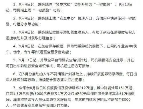 此外,滴滴出行启动安全大整治,9月8日至15日暂停深夜服务,还推出包括将乘客端原“紧急求助”功能升级为“一键报警”、上线“安全中心”快速入口、方便用户快速使用一键报警、行程分享等功能的七条整改措施。