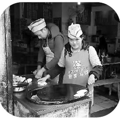 在王府井商城背后梓潼桥正街上,33岁的资阳小伙子张华均和老婆赵明媚围着一个锅盔摊,整日忙得不亦乐乎。自销加批发每天要做七八百个锅盔,早上四五点钟起床开工,晚上七八点收摊,回去还要做馅。