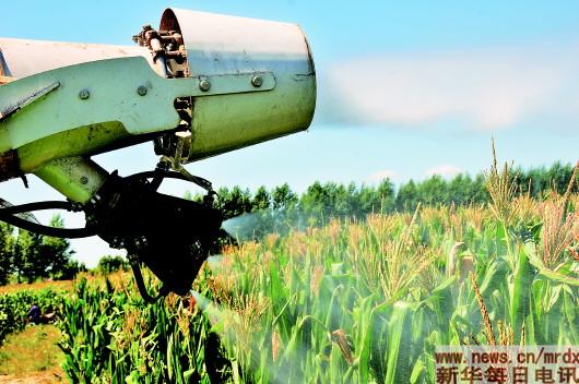 ▲在黑龙江省肇东市明久乡,一辆风送式高效远程喷雾机在玉米地里喷洒灭虫药。新华社记者王凯摄