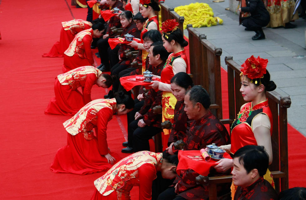 1月31日,杭州,小年夜前一天,一单位12位员工跪拜自己的父母,行传统拜年礼仪,并发给父母过年压岁钱。据主办方称,此次活动是为了提倡传统孝道,感谢父母多年的养育之情。视觉中国