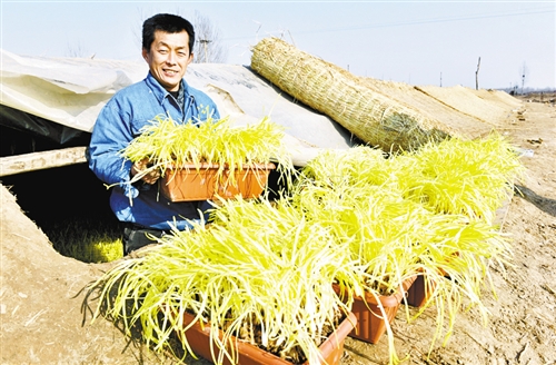 1月17日,记者走进华北平原中部的河北省深州市西安庄村,一排排半地下式的温室大棚映入眼帘,掀开厚厚的布帘进入棚内,只见一片片鲜嫩的无公害黄韭长势喜人、韭香扑鼻,不少村民正在收割、打捆、装箱。同时,很多村民将黄韭栽入特制的花盆内,做成了独具特色的盆景黄韭。