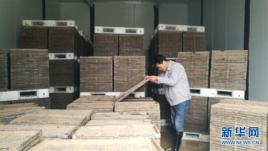 在湖南省衡阳县富农优质稻种植专业合作社的“暗室叠盆智能育秧车间”,工人在查看种子催芽情况(3月31日摄)。