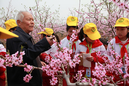 当日,山东省平邑县地方镇金池完小组织学生来到桃花盛开的桃园里开展“田间课堂”学农事活动,当地农技人员讲解桃的生长过程,让学生体验农耕文化学习农事,增长了知识。