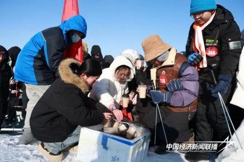 记录审核期间,现场贴心为挑战者们送上热奶茶暖身。与此同时,滑冰表演者化身黑悟空与紫霞仙子,在冰面上翩翩起舞,配合歌曲演唱、越野车绕行表演等精彩节目,将现场气氛推向高潮,欢快热烈的氛围弥漫在每一个角落。