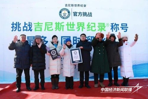 在全场参与者的翘首期盼中,认证官侯颖郑重宣布“最多人同时溜冰车”吉尼斯世界纪录挑战成功,并颁发认证证书。刹那间,景区冰面上彩烟升腾,参与者们的脸上洋溢着自豪与喜悦,共同见证这一荣耀时刻。