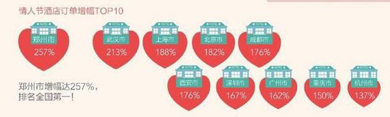 全国城市预定酒店增幅在2月14日情人节也得到了爆发,订单增幅前十位的城市分别是郑州、武汉、上海、北京、成都、西安、深圳、广州、重庆和杭州,郑州、武汉和上海分别以增幅257%、213%、188%为列前三甲。