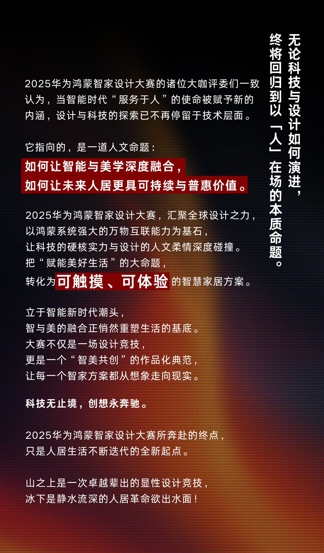 当科技早已为人居之美,写下了最浪漫的前言。设计师作为前沿科技创想到达人居生活的载体,更要以拥抱与赋能的姿态,为其谱写下精彩的后续。2025华为鸿蒙智家设计大赛,正是在这一契机下出发。以“科技产品转译为设计作品”为路径,汇聚全球卓越智能空间设计师,共同探索智能与美学的融合,去树立标杆、引领风向。