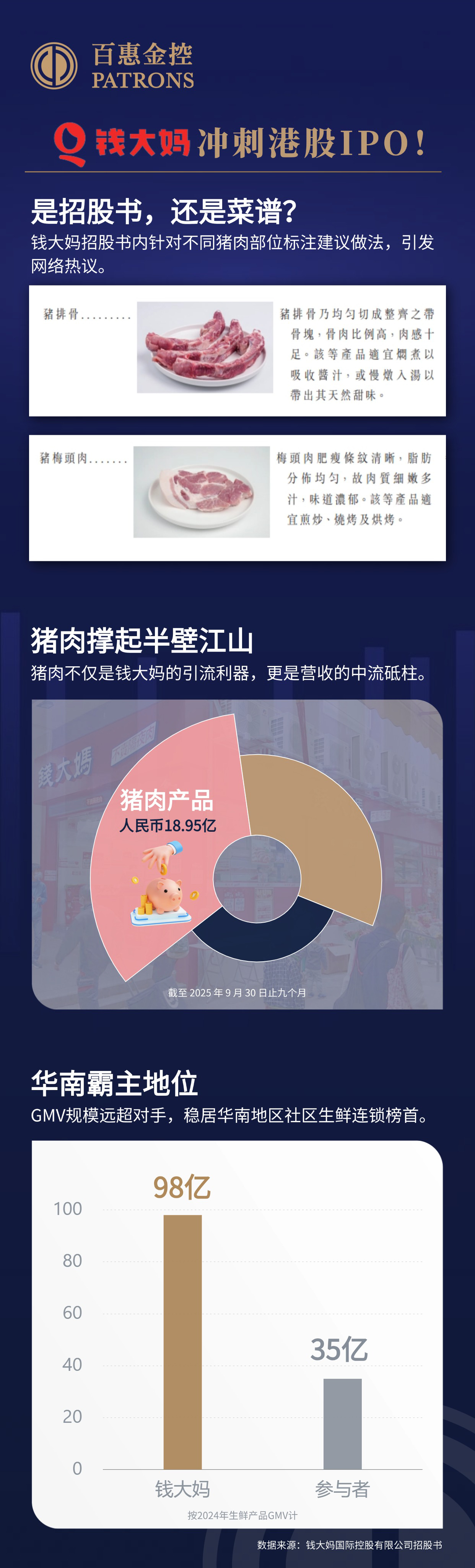 比如在介绍猪排骨时,招股书写到“适宜焖煮以吸收酱汁,或慢炖入以带出其天然甜味”;提及猪梅头肉时,建议“适宜煎炒、烧烤及烘烤”。网民笑言钱大妈这份招股书很实用,既能查阅业务数据,又能顺便学习家常菜谱。