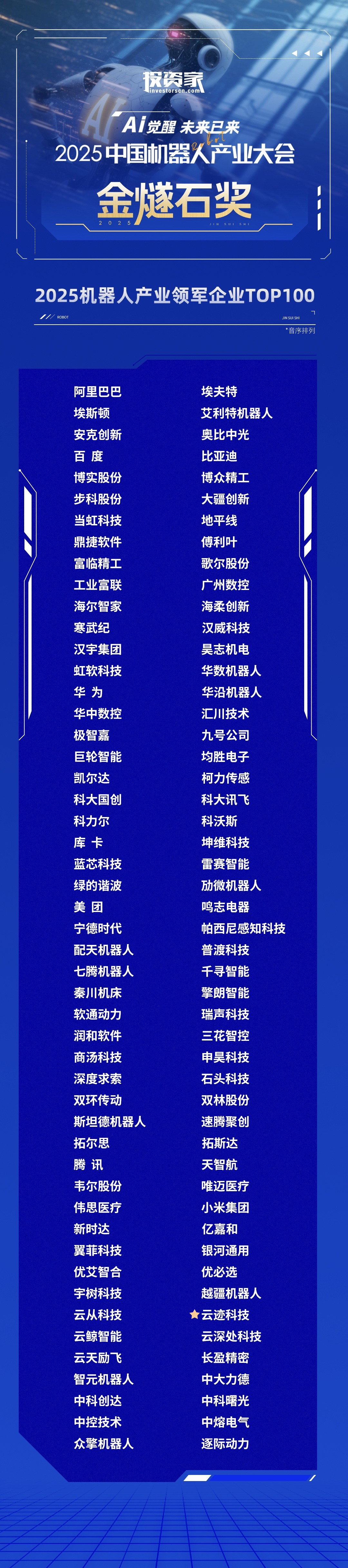 4月19日,备受瞩目的“2025机器人产业大会·金燧石奖”榜单重磅发布。凭借在AI智能体领域的深厚技术积累、卓越的产品创新以及显著的商业化落地成果,云迹科技与华为、阿里巴巴、腾讯、百度等科技巨头共同位列“2025机器人产业领军企业TOP100”榜单,荣获“2025机器人产业大会·金燧石奖”殊荣。此次获奖不仅是对云迹科技在机器人和人工智能领域综合实力的权威肯定,更标志着其AI智能体科研与应用两个维度均获得了业界高度认可。