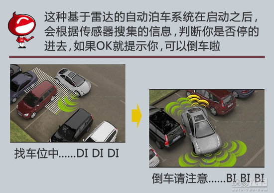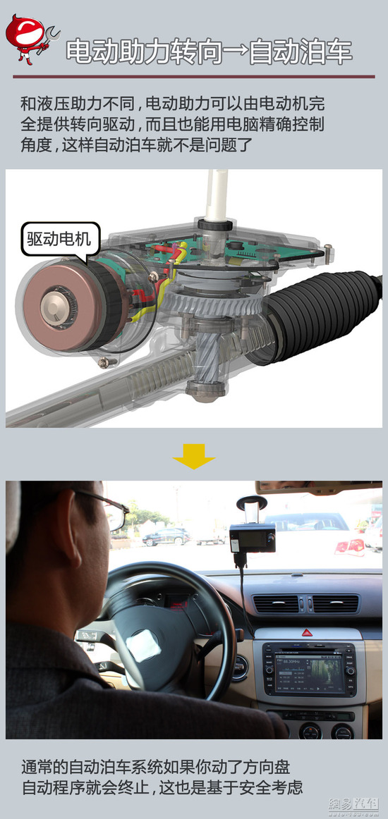 新司机最怕的就是“往右打死”、“回轮啊回轮啊”,这下好了,都交给自动泊车系统吧。一般自动泊车系统都采用电动助力转向,它可以自己转向,由预先写好的程序判断转向的时机和角度,做得好的自动泊车系统还能在停好车之后自动回正,一副“老司机”的派头。
