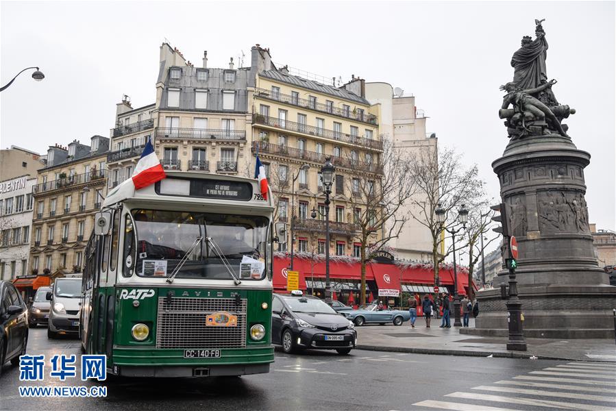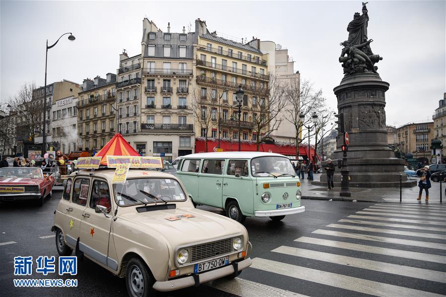 1月8日,老爷车驶过法国巴黎克利希广场。当日上午,700余辆轿车、公交车、摩托车、自行车等各式老爷车驶过巴黎的大街小巷,参加第17届老爷车穿越巴黎巡游活动。新华社记者陈益宸摄