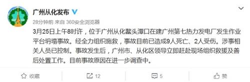 中新网3月25日电 据广州市从化新闻网络管理中心官方微博消息,3月25日上午8时许,位于广州从化鳌头潭口在建广州第七热力发电厂发生作业平台坍塌事故。经全力组织施救,事故目前已造成9人死亡、2人受伤。涉事相关人员已控制。事故发生后,广州市、从化区领导立即赶赴现场组织救援及善后处置工作。