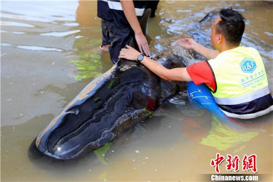 救护专家人员为鲸鱼泼水维持体表温度。陈思国 摄
