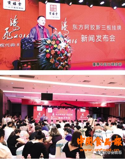 9月8日,记者在山东省东阿县举办的东方阿胶新三版挂牌新闻发布会上获悉,山东东阿东方阿胶股份有限公司已于7月27日在新三板成功挂牌,9月1日在北京举行了新三板挂牌上市的敲钟仪式,标志着东方阿胶正式与资本市场接轨,步入平稳快速发展时期,成为全国阿胶企业新三板“第一股”。当地多位政府领导、金融行业专家、众多知名商家以及人民网、凤凰网、中国食品报等20余国内主流媒体记者参会,共同研讨和交流阿胶保健品行业在资本运作之路的机遇和挑战,见证了东方阿胶的发展与未来。