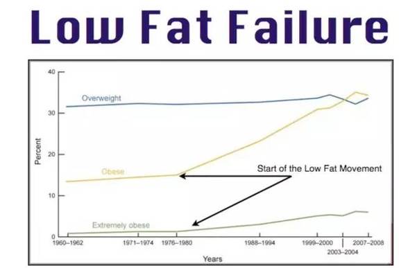 实际上,现在对低脂饮食的推广还要追溯到二战后,科学家对二战时期心脏病发病率增加的研究调查。研究表明,食用饱和脂肪会直接提高心脏病发病风险,这成为后来营养学的核心理念。肉和奶制品含有大量“不健康”的饱和脂肪。上世纪70年代美国提供饮食指导方针之际,心脏病正是造成美国人死亡的第一杀手。因此公共卫生官员急于展开低脂运动。