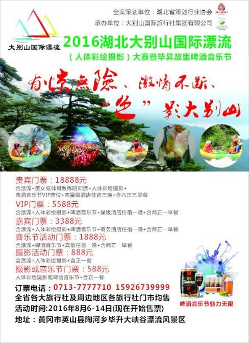 笔者获悉,湖北省策划行业协会受邀策划、大别山国际旅行社集团有限公司承办的2016年湖北大别山毕昇大峡谷漂流及人体彩绘摄影大赛将在湖北英山县毕昇大峡谷漂流风景区举办。据悉,8月6日至14日期间,每晚还都会有啤酒音乐欣赏会。