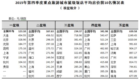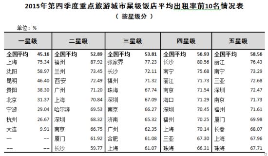 从第四季度各城市经营情况看,平均房价高于全国平均水平343.51元/间夜的有23个城市,位居前10位的分别为三亚、上海、杭州、北京、广州、深圳、厦门、拉萨、苏州、南京;平均出租率高于全国平均水平55.59%的有29个城市,位居前10位的分别为长沙、福州、张家界、南京、深圳、三亚、上海、珠海、厦门、南宁;每间可供出租客房收入高于平均水平190.95元/间夜的有23个城市,位居前10位的分别为三亚、上海、深圳、广州、北京、杭州、厦门、南京、长沙、福州;每间客房平摊营业收入高于全国平均水平37767.47元/间的有22个城市,位居前10位的分别为上海、杭州、温州、无锡、北京、三亚、南京、广州、苏州、厦门。(以上排序城市不包括填报率不足60%的郑州、洛阳两市)