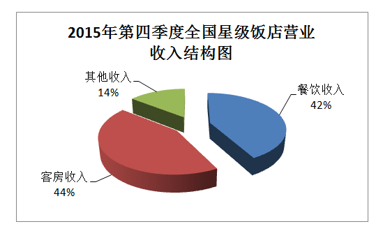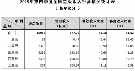 全国10956家星级饭店第四季度的营业收入合计577.77亿元,其中餐饮收入为243.70亿元,占营业收入的42.18%;客房收入为250.87亿元,占营业收入的43.42%。