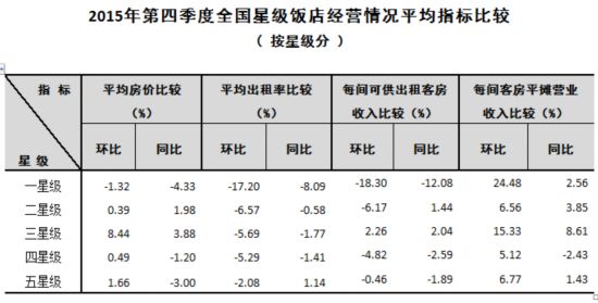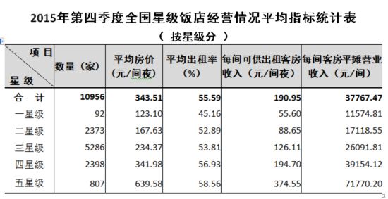 全国第四季度星级饭店平均房价为343.51元/间夜,平均出租率为55.59%,每间可供出租客房收入为190.95元/间夜,每间客房平摊营业收入为37767.47元/间。