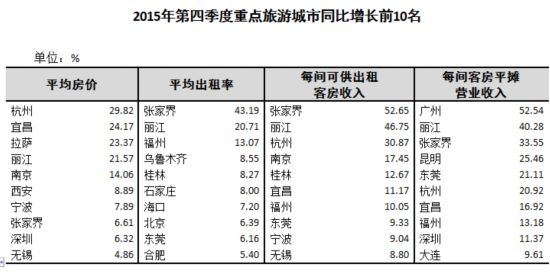 平均房价:增幅位居前10位的城市为杭州、宜昌、拉萨、丽江、南京、西安、宁波、张家界、深圳、无锡,其中杭州增幅最大为29.82%;降幅位居前10位的城市为西宁、三亚、沈阳、兰州、银川、南昌、昆明、泉州、南宁、成都,其中西宁降幅最大为18.44%。平均出租率:增长位居前10位的城市为张家界、丽江、福州、乌鲁木齐、桂林、石家庄、海口、北京、东莞、合肥,其中张家界增幅最大为43.19%;降幅位居前10位的城市为秦皇岛、拉萨、西安、宜昌、大连、呼和浩特、长沙、重庆、银川、贵阳,其中秦皇岛降幅最大为22.01%。每间可供出租客房收入:增幅位居前10位的城市为张家界、丽江、杭州、南京、桂林、宜昌、福州、东莞、宁波、无锡,其中张家界增幅最大为52.65%;降幅位居前10位的城市为秦皇岛、西宁、三亚、银川、呼和浩特、兰州、南昌、重庆、南宁、大连,其中秦皇岛降幅最大为24.19%。每间客房平摊营业收入:增长增幅位居前10位的城市为广州、丽江、张家界、昆明、东莞、杭州、宜昌、福州、深圳、大连,其中广州增幅最大为52.54%;降幅位居前10位的城市为秦皇岛、西宁、长沙、兰州、三亚、珠海、泉州、南昌、重庆、拉萨,其中秦皇岛降幅最大为27.47%。(以上排序城市不包括填报率不足60%的郑州、洛阳两市)
