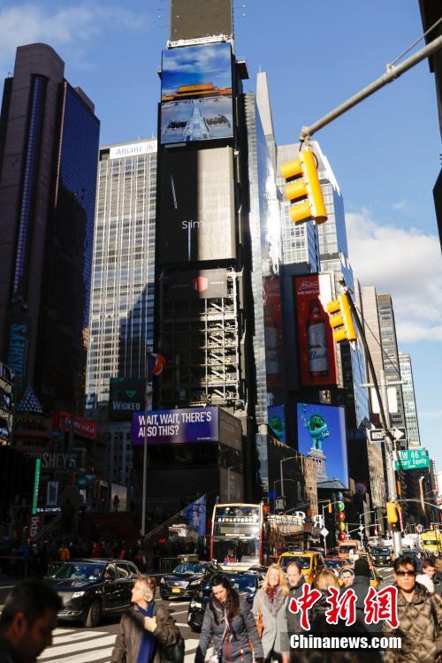 当地时间11月22日,纽约时代广场户外屏幕播放着中国旅游形象宣传片。时值2016中美旅游年收官之际,该宣传片将每日在纽约时代广场循环播放直至月底,以展示中国著名旅游景点的迷人风采,吸引美国游客赴中国旅游。中新社发 袁月明 摄