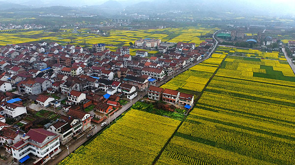 勉县天荡山下的万亩油菜花盛开,村庄被花海包围(3月19日摄)。