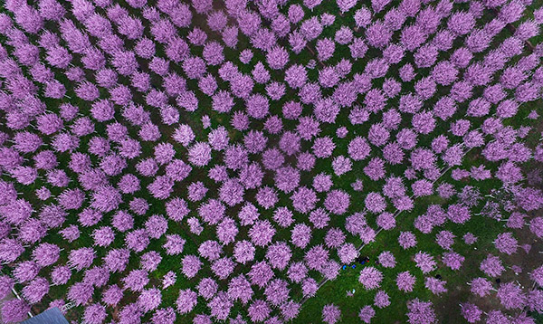3月19日,游客在勉县天荡山下的数十亩盛开的春梅园赏花。