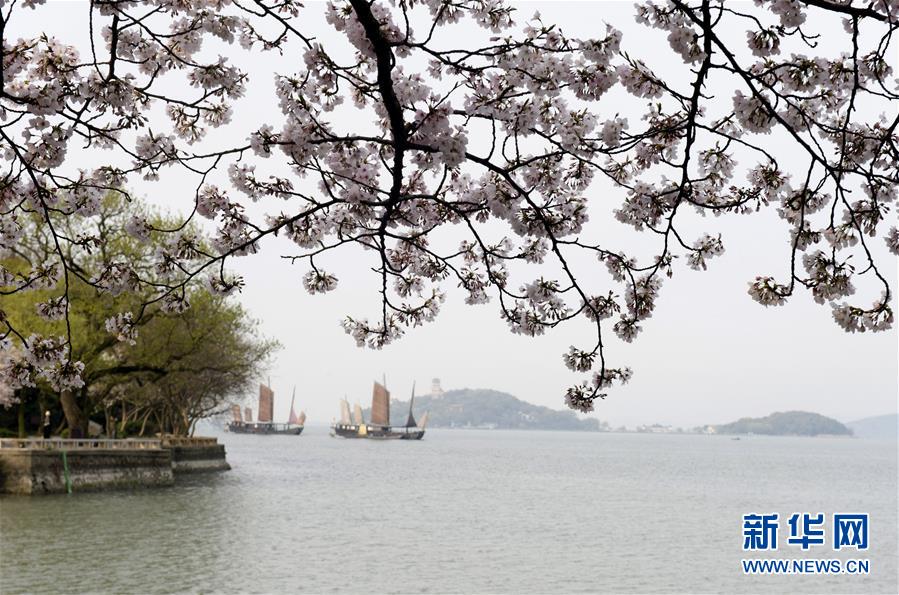 3月31日,江苏无锡太湖鼋头渚景区樱花盛开。近日,太湖樱花烂漫正当时,吸引众多游客前来赏樱游玩。 新华社发(潘正光 摄)