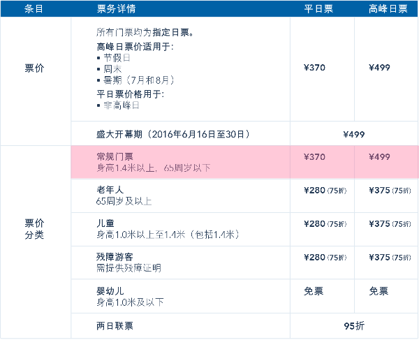 上海迪士尼门票价格如下,除去开业期间以及各类老弱病残和婴儿票,以常规门票计算:日票:370元,高峰日票:499元。