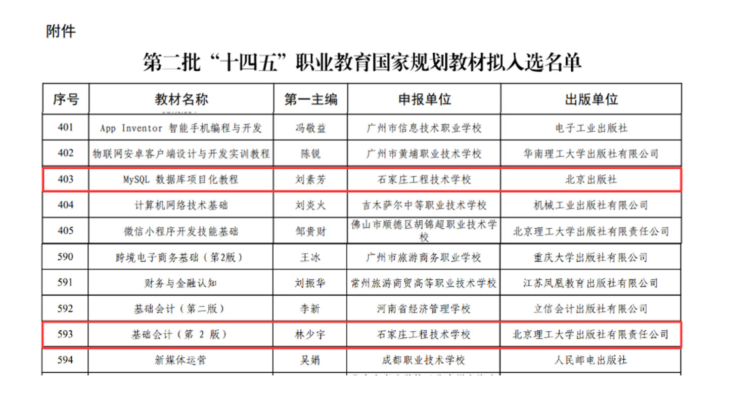 中经联播讯(通讯员 荣超)近日,教育部职业教育与成人教育司公布第二批“十四五”职业教育国家规划教材遴选结果。经形式审查、网络评议、专家会议评审等严格程序,石家庄工程技术学校教师林少宇主编的《基础会计(第二版)》和刘素芳主编的《MySQL数据库项目化教程》成功入选,实现该校国家级规划教材建设的新突破。