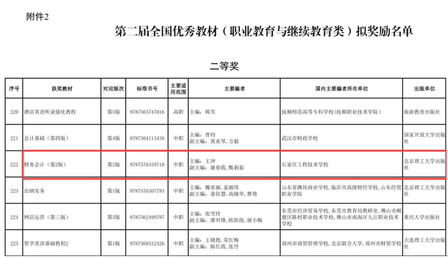 中经联播讯(通讯员 荣超)近日,国家教材委员会公布第二届全国教材建设奖评选结果。经出版单位申报、地方初评、国家评审、社会公示等严格程序,全国共评选出优秀教材989种。石家庄工程技术学校教师王冲主编的《财务会计》教材荣获职业教育与继续教育类“全国优秀教材奖”二等奖,实现学校在国家级教材最高奖项上的重要突破。