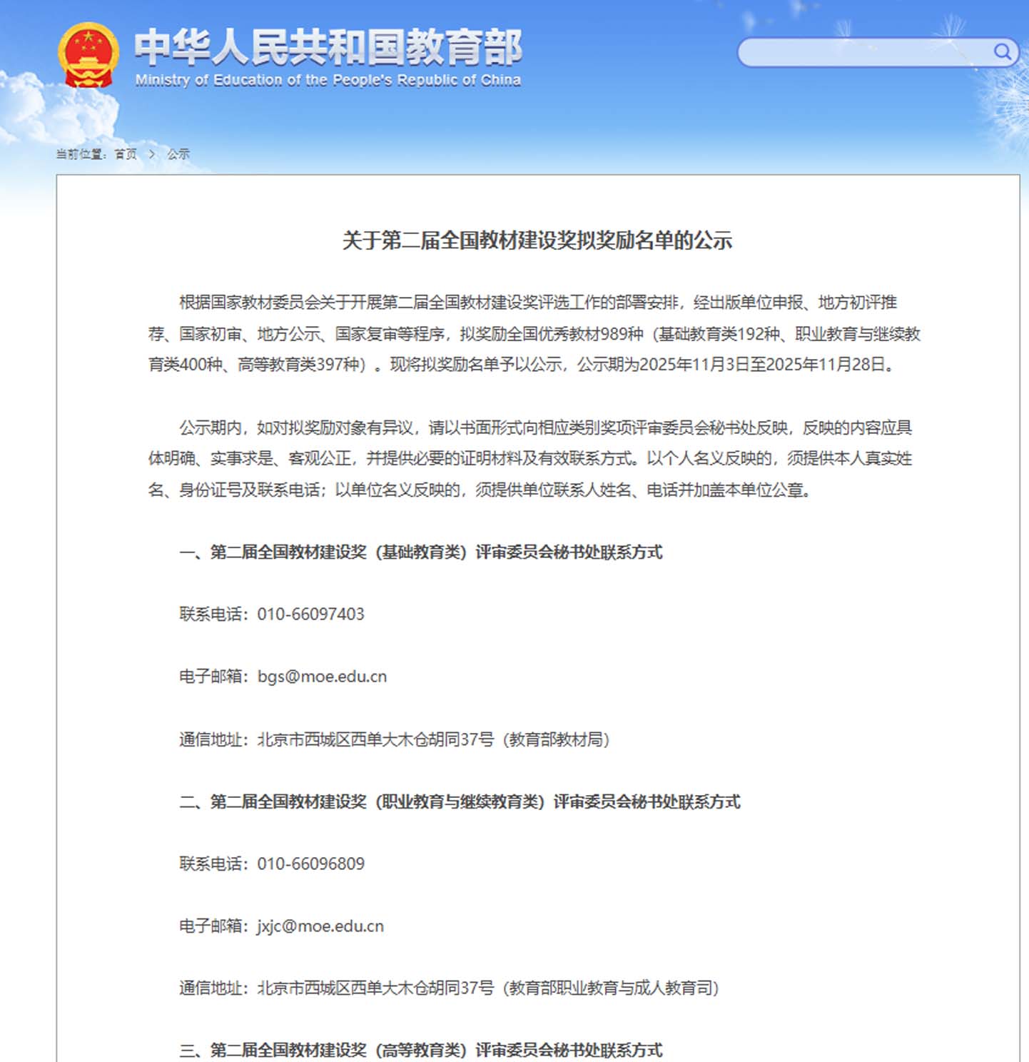 全国教材建设奖是教育部设立的**中国教材领域最高奖项**,由国家教材委员会主办,每四年评选一次,旨在表彰在教材建设中作出突出贡献的集体和个人,推动形成高质量教材体系,服务新时代人才培养需求。