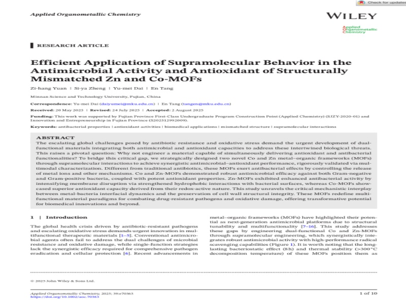 生命科学与化学学院2022级生物工程专业学生袁梓航、郑思雅,正是这个集体的受益者——她们以共同第一作者身份(指导老师:唐恩教授、戴玉梅教授),在SCI二区期刊《AppliedOrganometallicChemistry》(应用有机金属化学)在线发表研究论文,用亮眼成果印证了“个人拼搏”与“集体守护”的双向成就,满含坚持、互助与感动的科研旅程,更是温暖集体育人力量的生动写照。