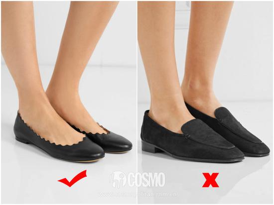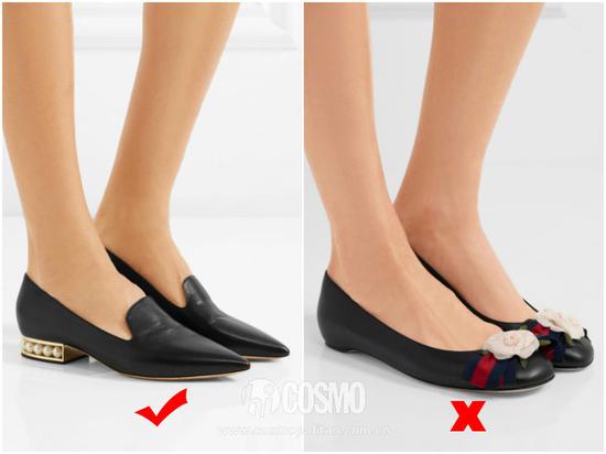 浅口平底鞋比起深口鞋更显腿长,因为脚面裸出来的面积会更多,所以在视觉上会更加拉长腿长。